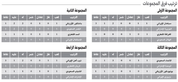 ويتصدر سبهان أصفهان الإيراني المجموعة الأولى برصيد ثلاث نقاط بعد فوزه على الهلال ثم يليه الغرافة القطري والجزيرة الإماراتي برصيد نقطة واحدة لكل منهما بتعادلهما، بينما يتذيل الهلال المجموعة بلا رصيد من النقاط.